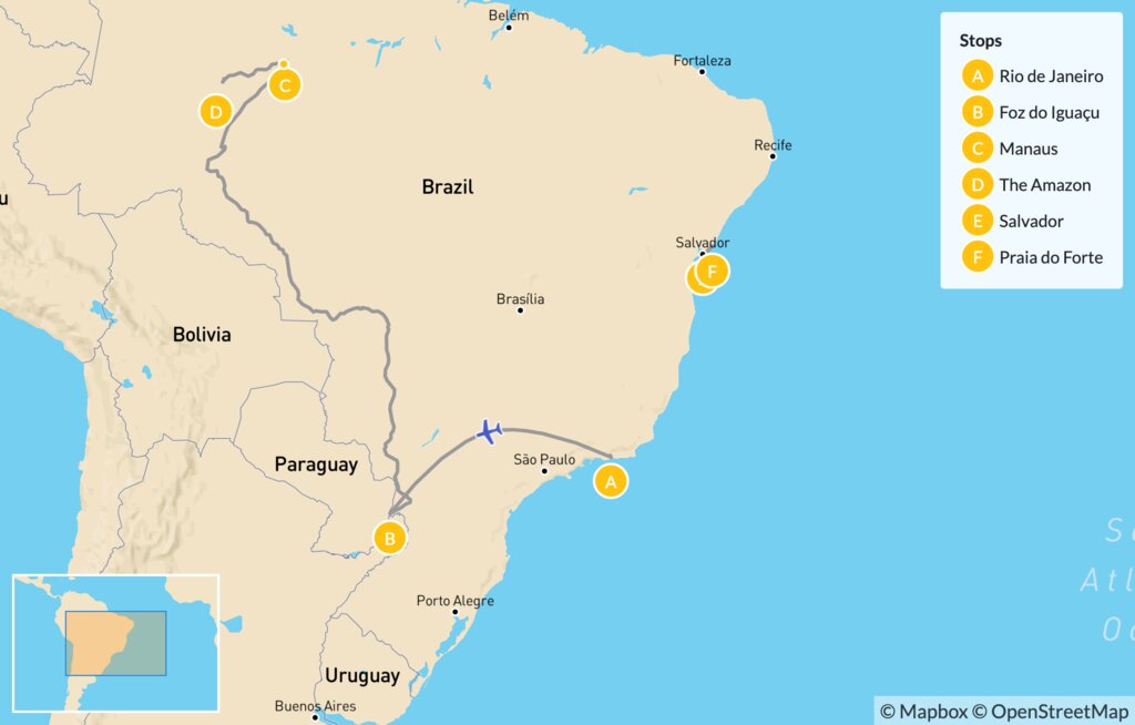 Map of Highlights of Brazil: Rio, Iguaçu, the Amazon & Bahia – 14 Days