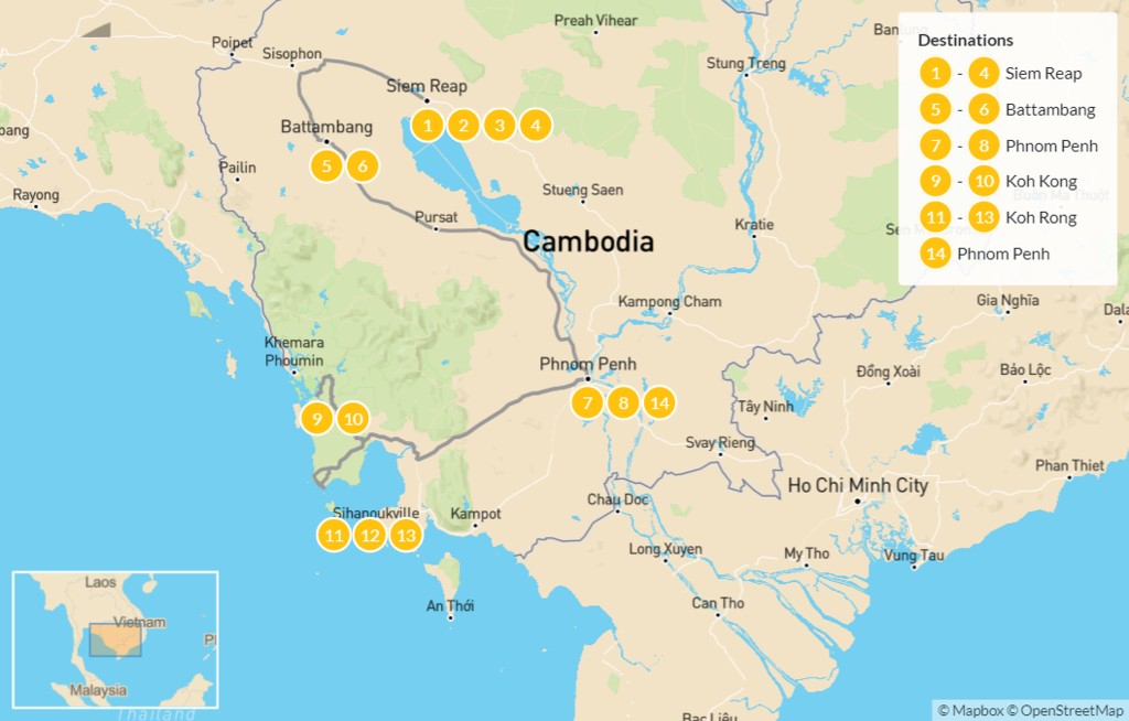 Map of Highlights of Cambodia: Siem Reap, Angkor, Phnom Penh, Koh Rong & More – 15 Days