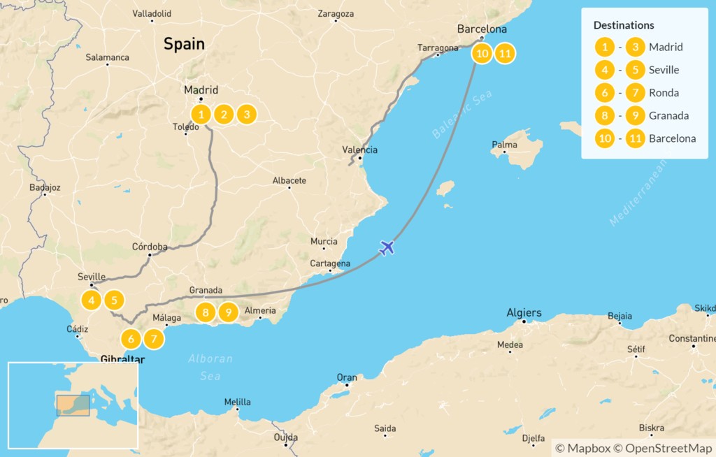 Map of Highlights of Central and Southern Spain: Madrid, Seville, & Barcelona – 12 Days