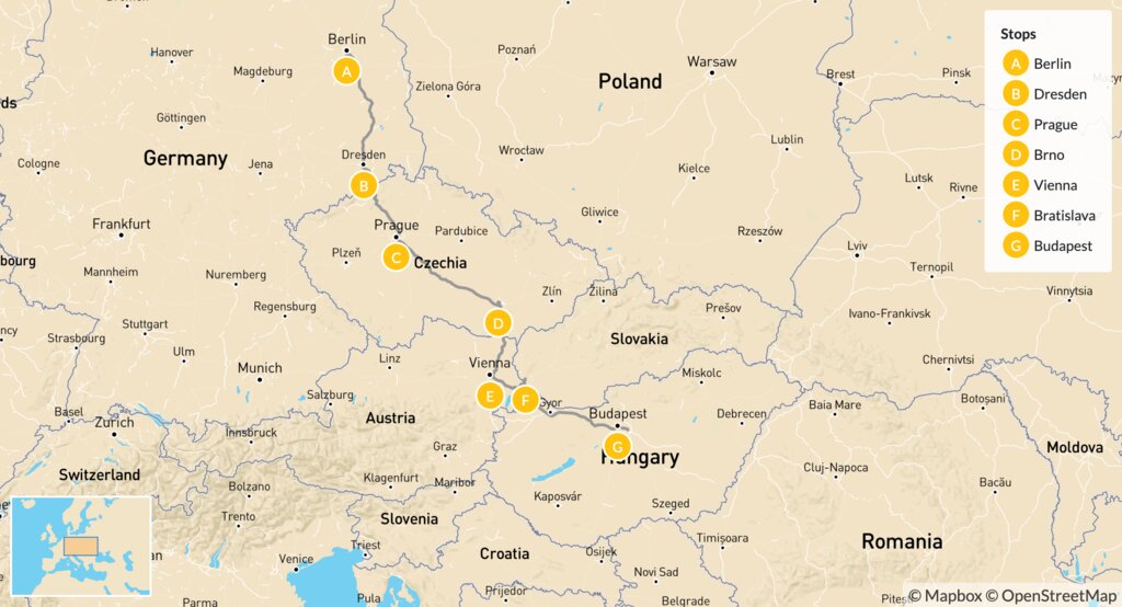 Map of Highlights of Central Europe: Berlin, Dresden, Prague, Brno, Vienna, Bratislava & Budapest – 10 Days