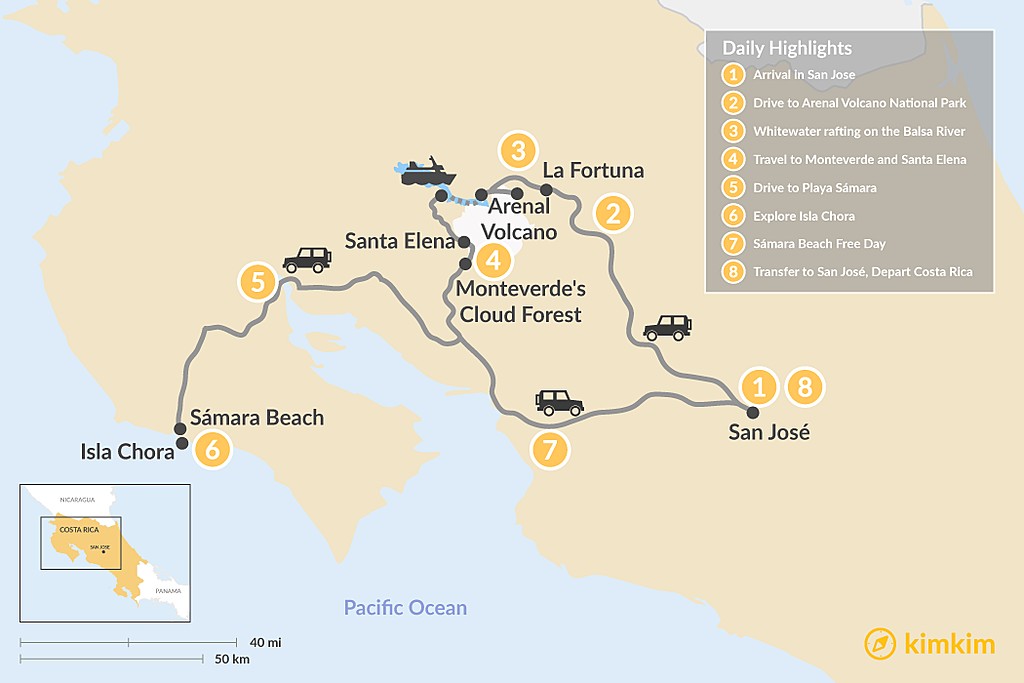 Map of Highlights of Costa Rica: Arenal, Monteverde, & Playa Sámara – 10 Days