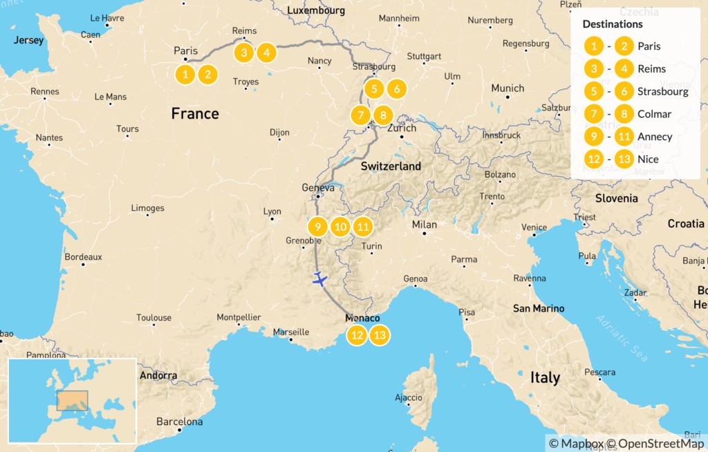 Map of Highlights of Eastern France: Paris, Reims, Strasbourg, Colmar, Annecy, & Nice – 14 Days