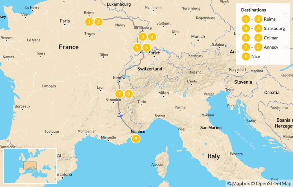 Map of Highlights of Eastern France: Reims, Strasbourg, Colmar, Annecy, & More – 10 Days