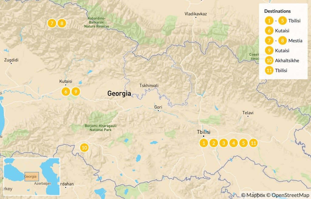 Map of Highlights of Georgia: Tbilisi, Caucasus Mountains, & More – 12 Days