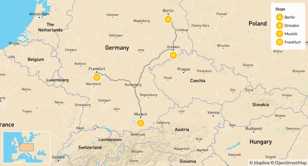 Map of Highlights of Germany: Berlin, Dresden, Munich & Frankfurt – 10 Days