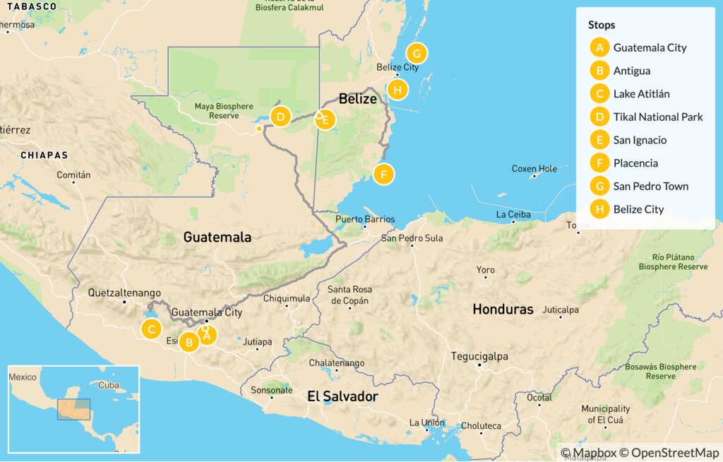 Map of Highlights of Guatemala & Belize: Ruins, Reefs, Volcanoes & Lakes – 13 Days