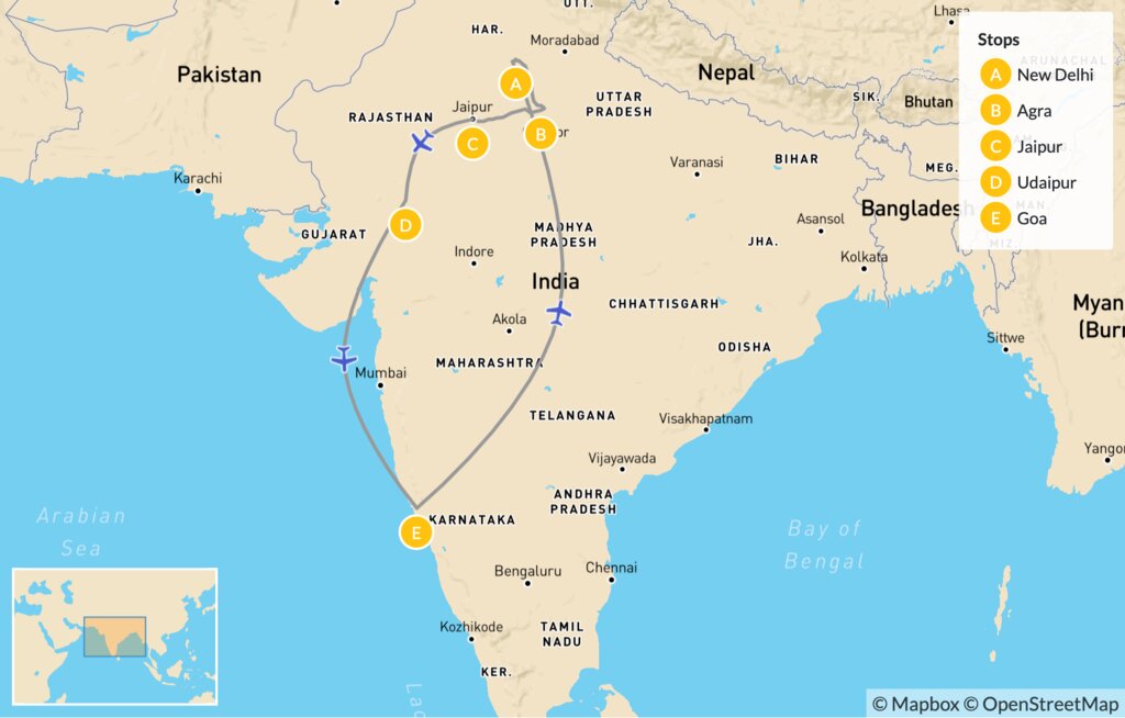 Map of Highlights of India Honeymoon: Golden Triangle, Rajasthan & Goa – 14 Days