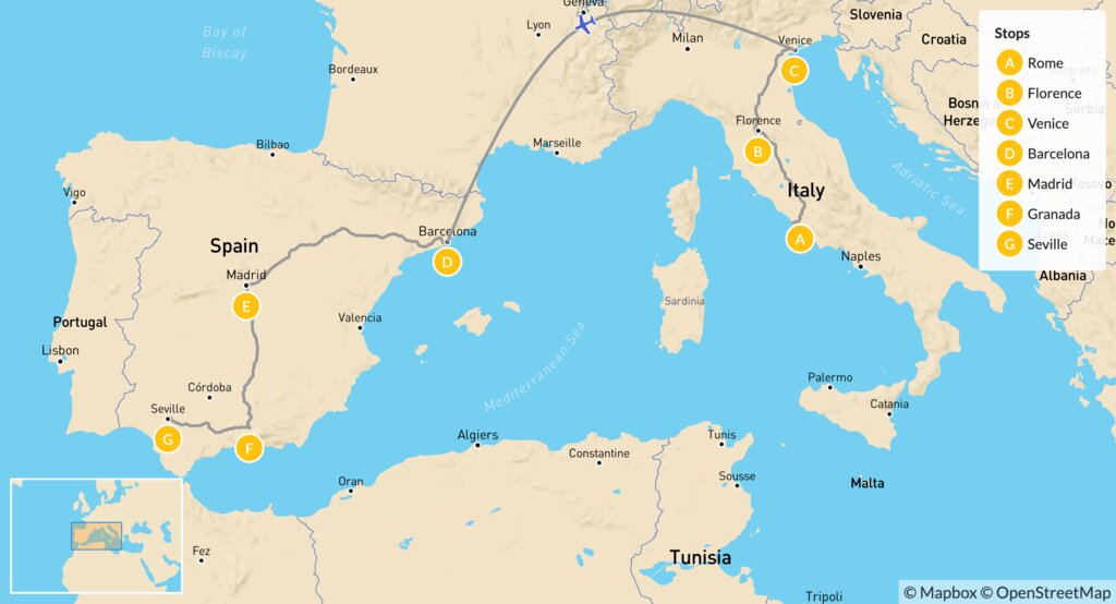 This three-week adventure traverses Italy and Spain, two countries whose thousands of years of history will leave you awestruck. In Rome, hit all the highlights, from the Colosseum to Vatican City, before heading to the twin pillars of romance known as Venice and Florence. Then, hop over to Spain to discover its rich culture with art, history, and guided food tours in Barcelona, Madrid, and Andalusia.