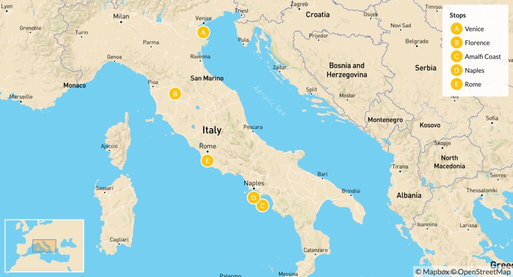 Map of Highlights of Italy: Venice, Florence, Rome, Naples – 14 Days