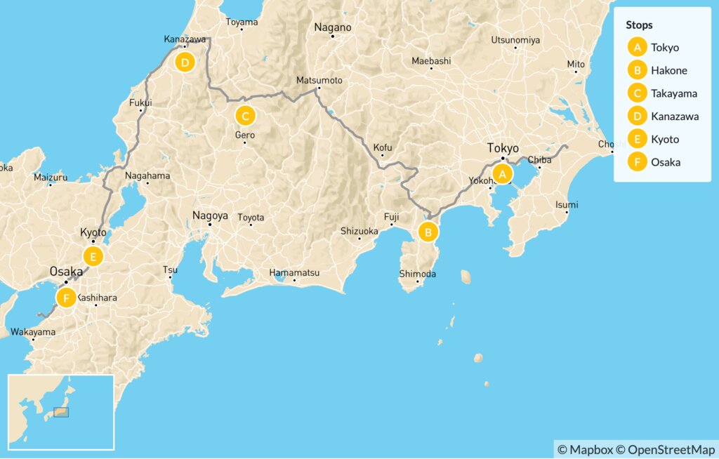 Map of Highlights of Japan: Tokyo, Hakone, Takayama, Kanazawa, Kyoto & Osaka — 16 Days