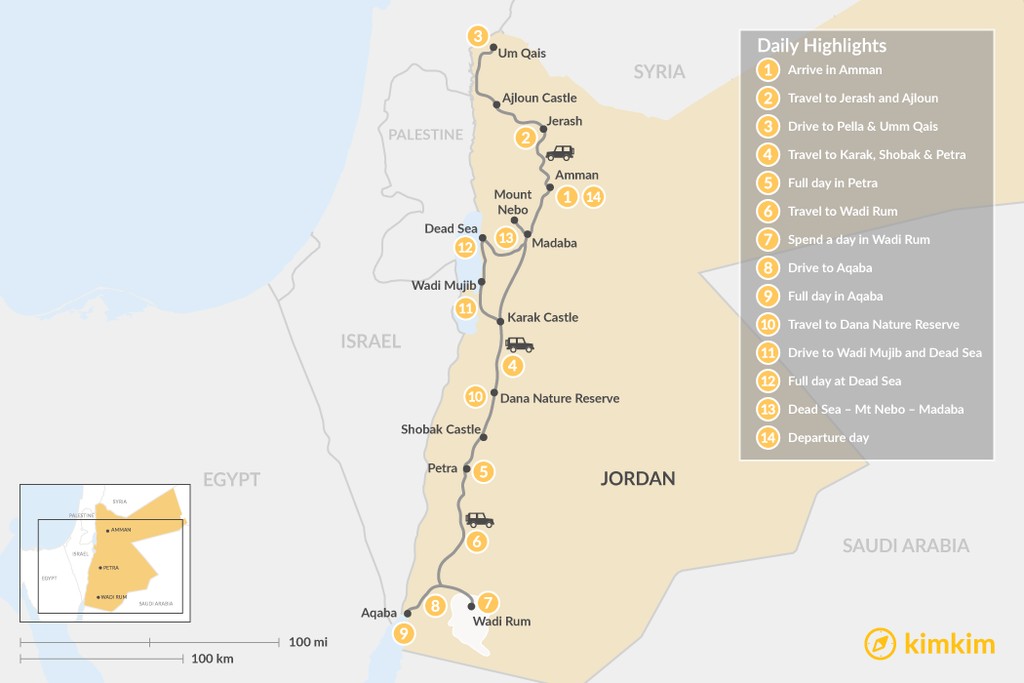 Map of Highlights of Jordan: Petra, Wadi Rum, Dead Sea, & More – 14 Days