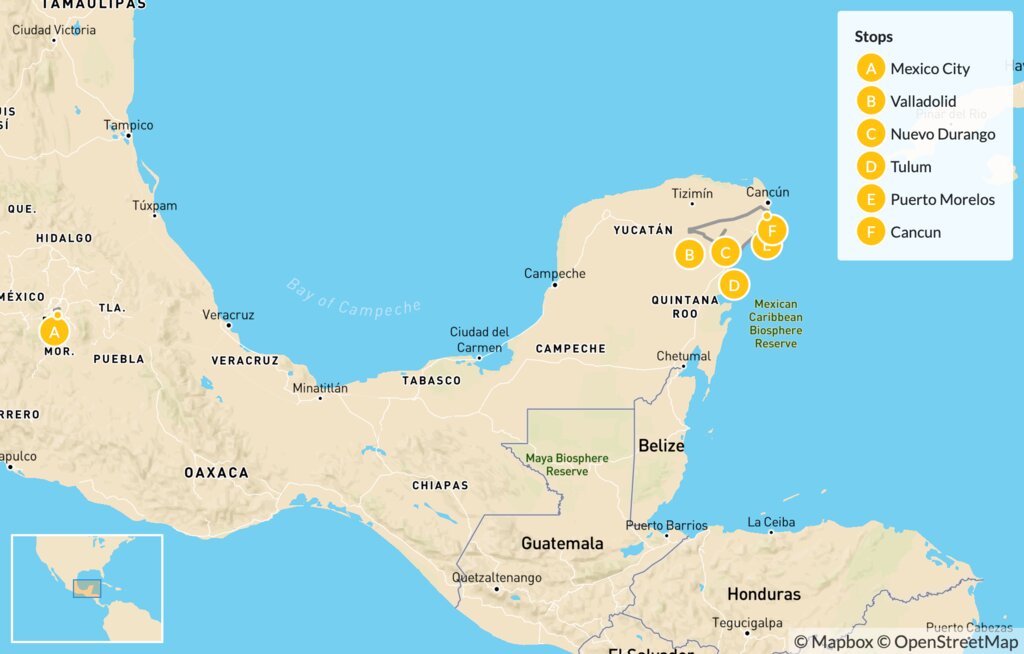 Map of Highlights of Mexico City & the Riviera Maya – 11 Days