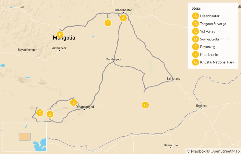 Map of Highlights of Mongolia: Desert, Mountains, History & Culture – 10 Days