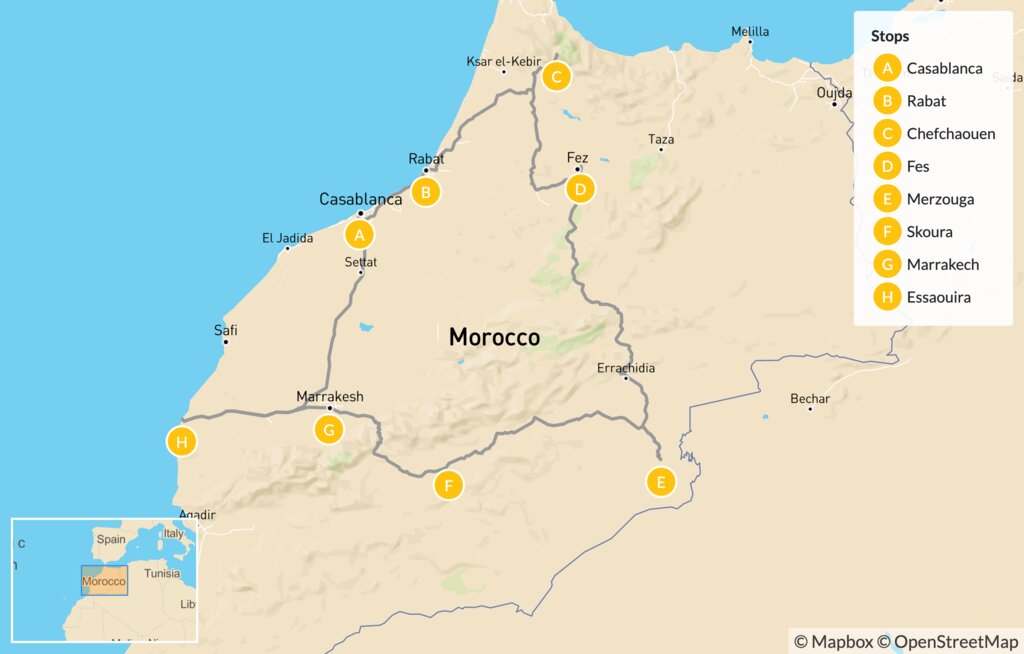 Map of Highlights of Morocco: Casablanca to Essaouira – 15 Days