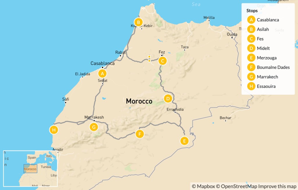 Map of Highlights of Morocco: Fes, Atlas Mountains, Dades Valley, Marrakech & Essaouira – 14 Days