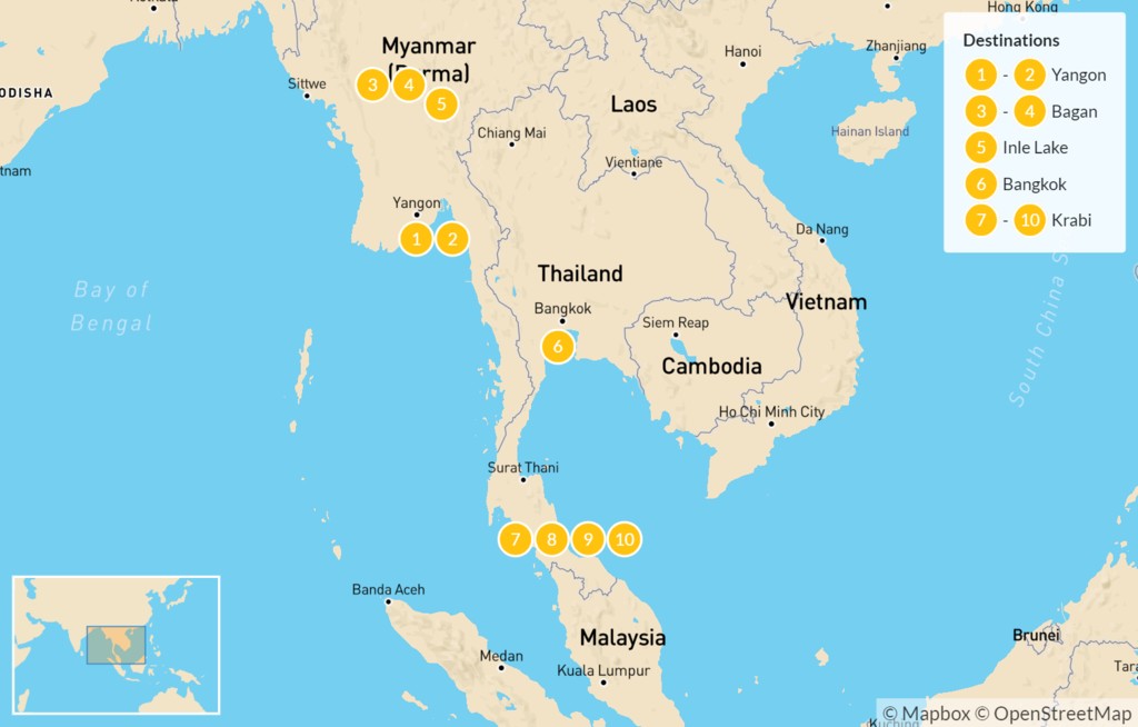 Myanmar and Thailand are two of the most exciting Southeast Asian destinations. This 11-day tour includes a variety of highlights from both countries, including the cultural riches of Myanmar, and the beautiful tropical beaches of Thailand. Explore the ancient temples of Bagan, be amazed by the glittering gold Shwedagon Temple in Yangon, and cruise around Inle Lake. Then, spend several days relaxing on beaches and island hopping around Krabi.