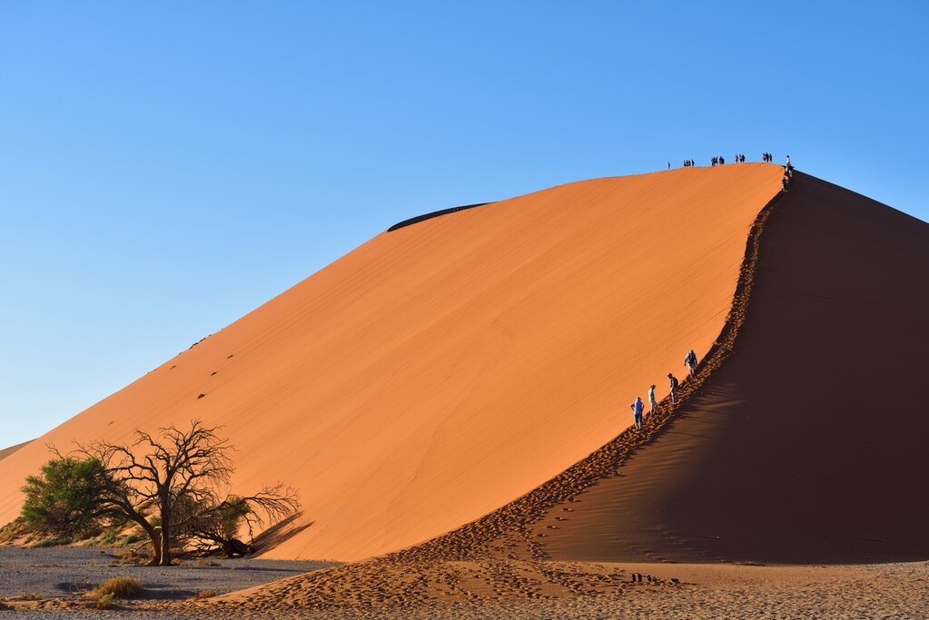 After just one night in Windhoek, leave the capital behind to drive five hours to Sossusvlei in the Namib Desert. On your way, stop in the small town of Solitaire to get gas, snacks, and any other supplies you may need on your road trip. Back in the car, watch as the landscape changes from arid plains to the towering red dunes of the desert. When you arrive, check into your hotel and refresh before venturing out to explore the area on your own. One of the most popular activities in the area is climbing Dune 45, named after its location at the 45th kilometer along the road leading into the desert.
