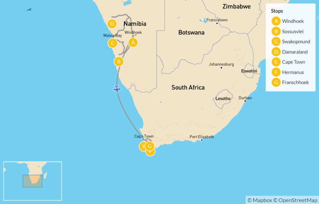 | Day 1 | Arrive in Windhoek (Namibia), Explore the Capital at Your Own Pace | Windhoek |