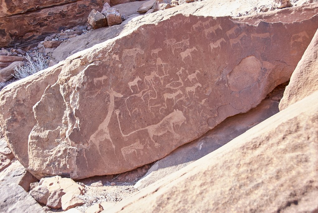 Head to Twyfelfontein to see the UNESCO-listed rock carvings etched into red sandstone mountains thousands of years ago by early hunter-gatherer communities. Wander through the open-air art gallery and admire the ancient etchings depicting wildlife, human figures, and intricate geometric patterns. Continue to the Petrified Forest, a surreal landscape of fossilized tree trunks that have existed since the Triassic period. Stroll through the ancient forest and admire the trunks lined with agate, jasper, and other minerals formed by the petrification process.
