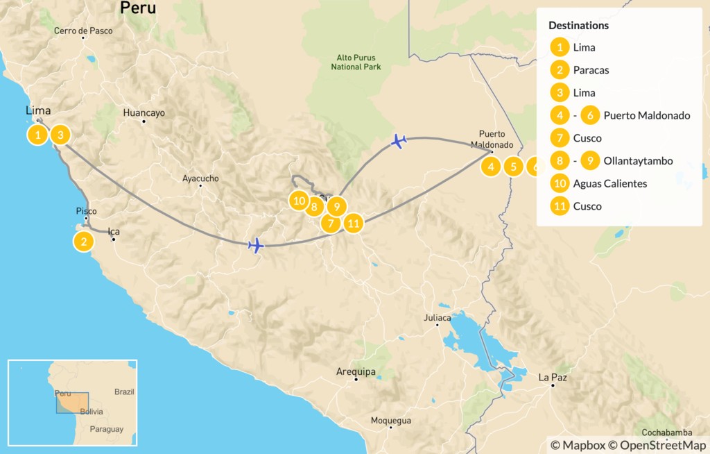 Map of Highlights of Peru: Machu Picchu, Inca Train, Nazca Lines & Ballestas Islands – 12 Days