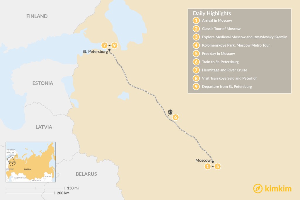 Map of Highlights of Russia’s Two Capitals – 9 Days
