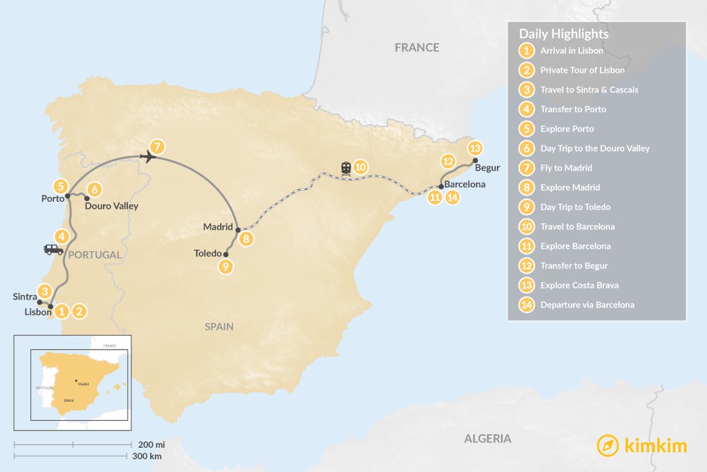 Map of Highlights of Spain & Portugal: Cities, Beaches, & Culture – 14 Days