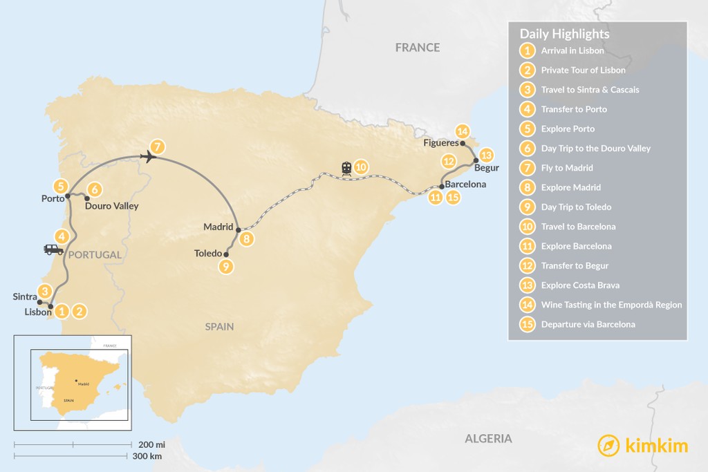 Map of Highlights of Spain & Portugal: Cities, Beaches & Culture – 15 Days