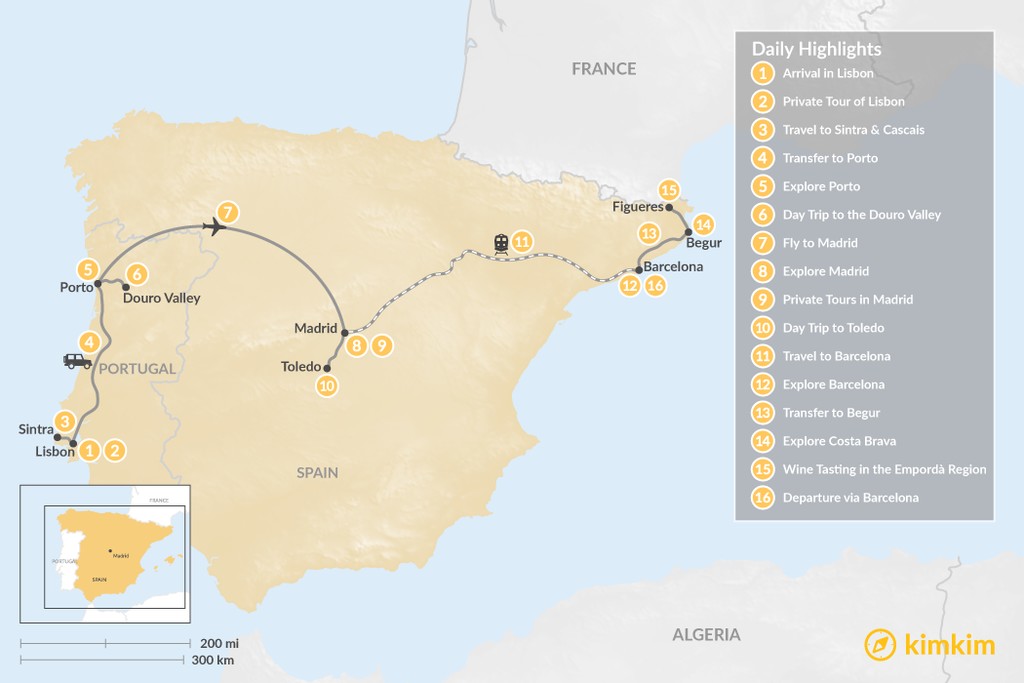 Map of Highlights of Spain & Portugal: Cities, Beaches, & Culture – 16 Days