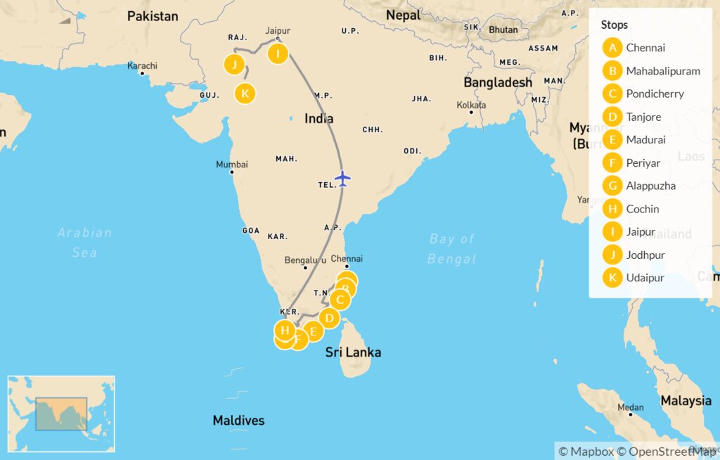 Map of Highlights of Tamil Nadu, Kerala & Rajasthan – 15 Days