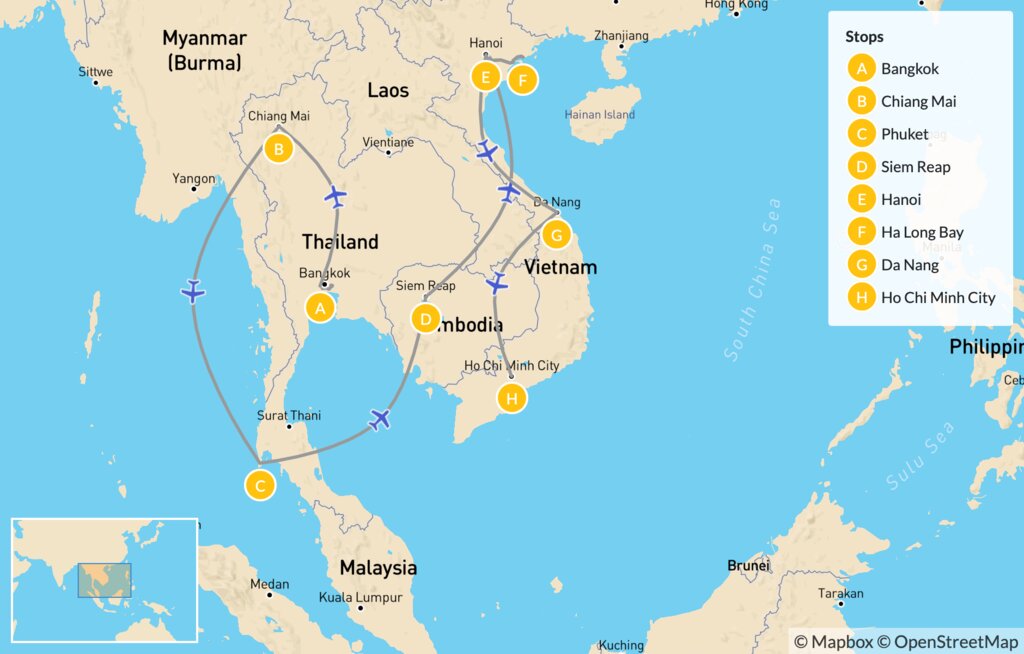 Map of Highlights of Thailand, Cambodia & Vietnam – 14 Days