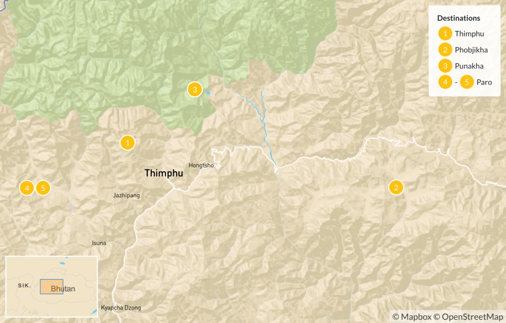 Enjoy centuries of traditions set amid views of forests and mountains with this trip through western Bhutan. You’ll start in the capital city of Thimphu to experience Bhutanese traditions as they’ve evolved into the modern era, then descend into the glacial valley of Phobjikha, the winter home of the black-necked crane. End your journey in the emerald Paro valley with a hike up to the famous Tiger’s Nest monastery in its cliffside home.