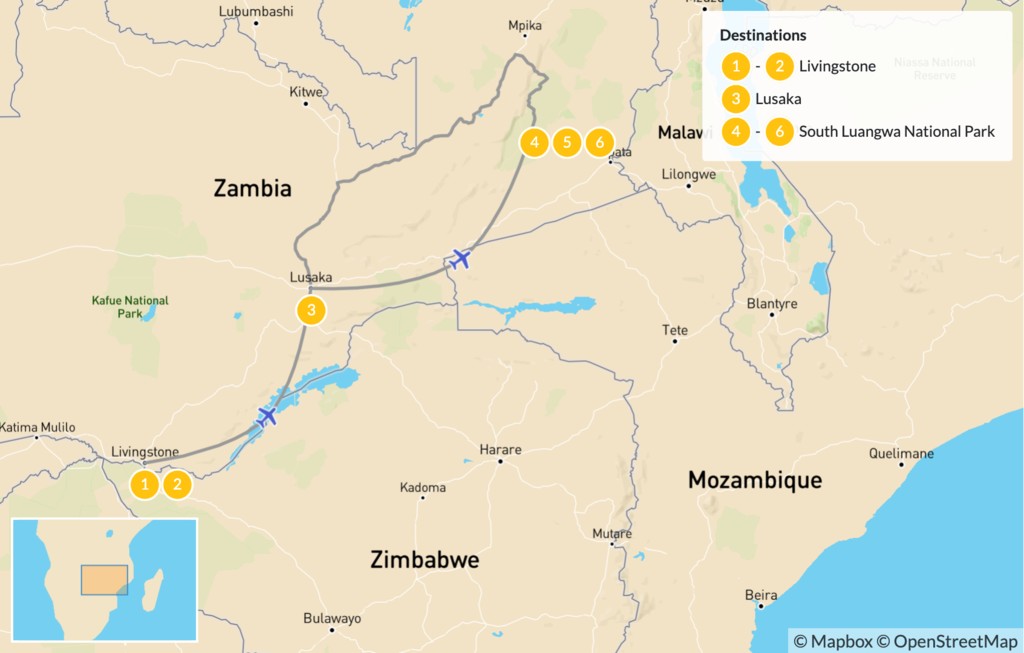 Map of Highlights of Zambia: Victoria Falls & South Luangwa – 7 Days