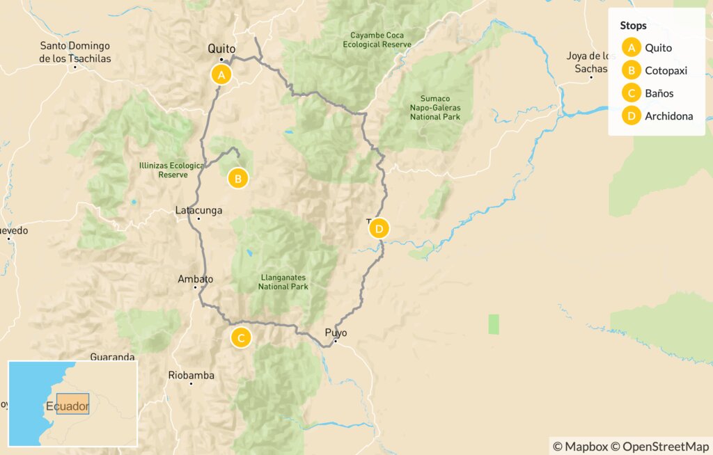 Map of Hike, Rock Climb & Sightsee in Ecuador: Quito, Cotopaxi, Baños & Archidona – 11 Days