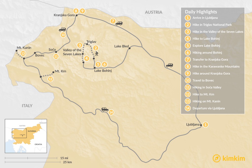 Map of Hiking Adventure through Slovenia: The Alps, Lake Bohinj, & the Soča Valley – 14 Days