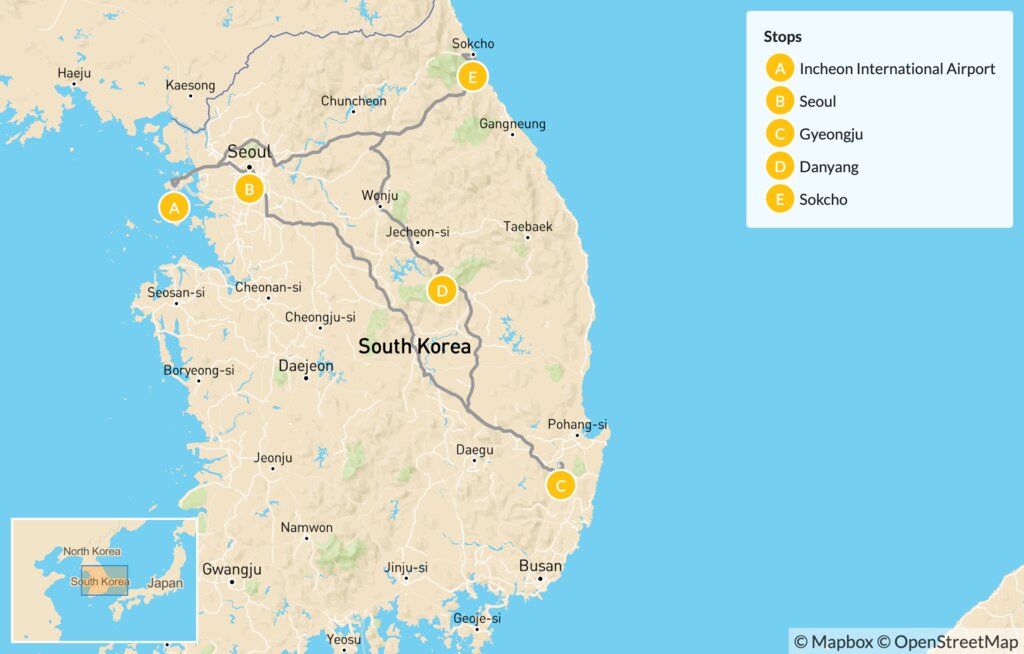 Map of Hiking in South Korea’s National Parks: Bukhansan, Gyeongju, Sobaeksan & Seoraksan – 9 Days