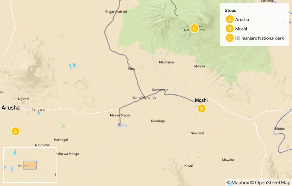 | Day 1 | Arrive in Arusha, Transfer to Moshi | Moshi |