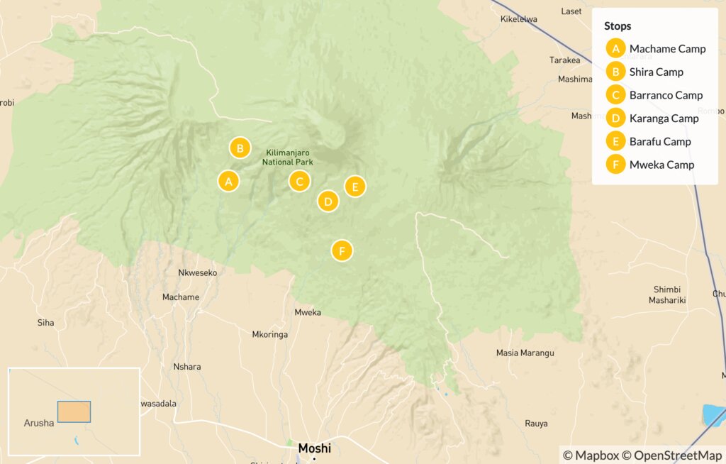| Day 1 | Arrive in Tanzania, Transfer to Kilimanjaro, Hike to Machame Camp | Machame Camp |