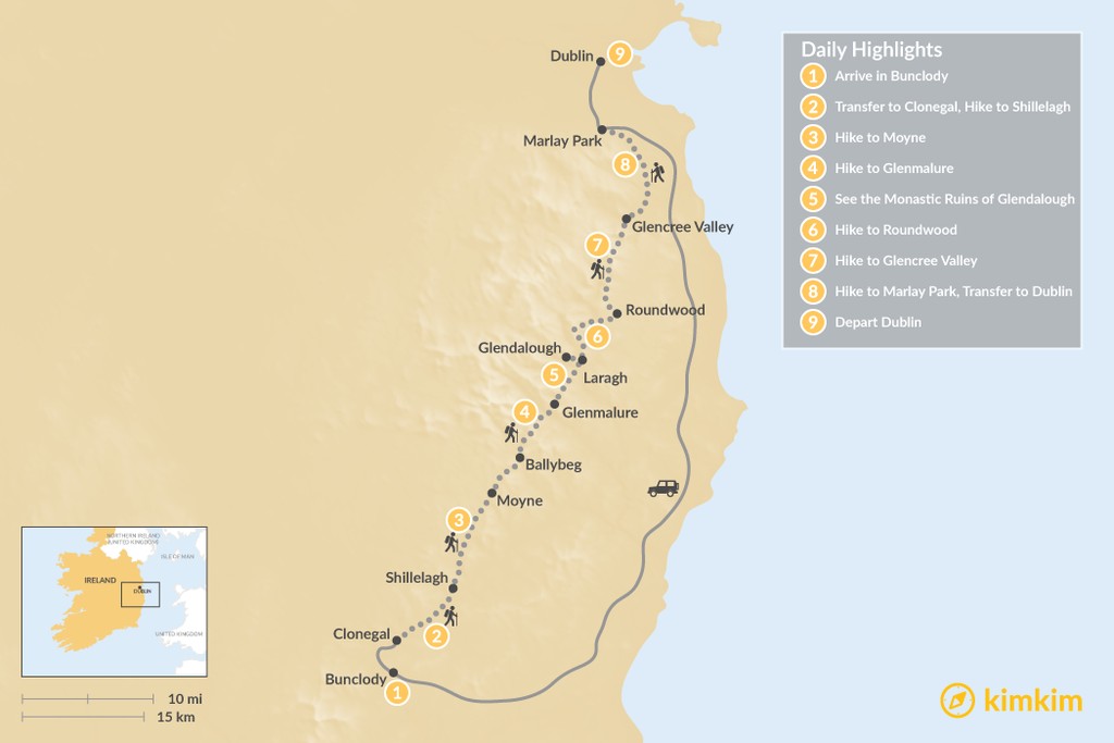 This itinerary takes adventurous travelers through ancient forests and glacial valleys of Ireland’s Wicklow Mountains. Starting in the picturesque village of Clonegal, you’ll hike along Ireland’s most popular hiking trail that winds through small towns and country villages where you can experience authentic Irish hospitality. End your hiking trip in Dublin, where you can wander around Marlay Park and enjoy the lively nightlife.