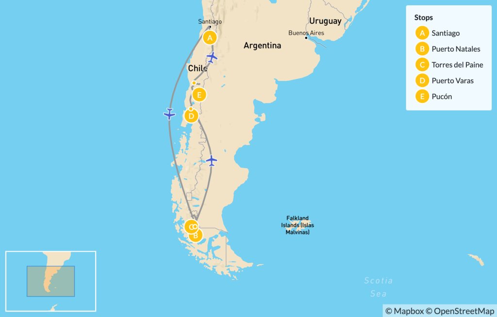 Map of Hiking Tour in Chilean Patagonia: Torres del Paine, Lakes District & Volcanoes – 16 Days