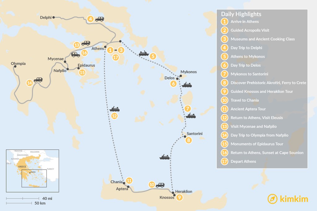 Map of Historic Athens, Mainland Greece, Cyclades, and Crete – 17 Days