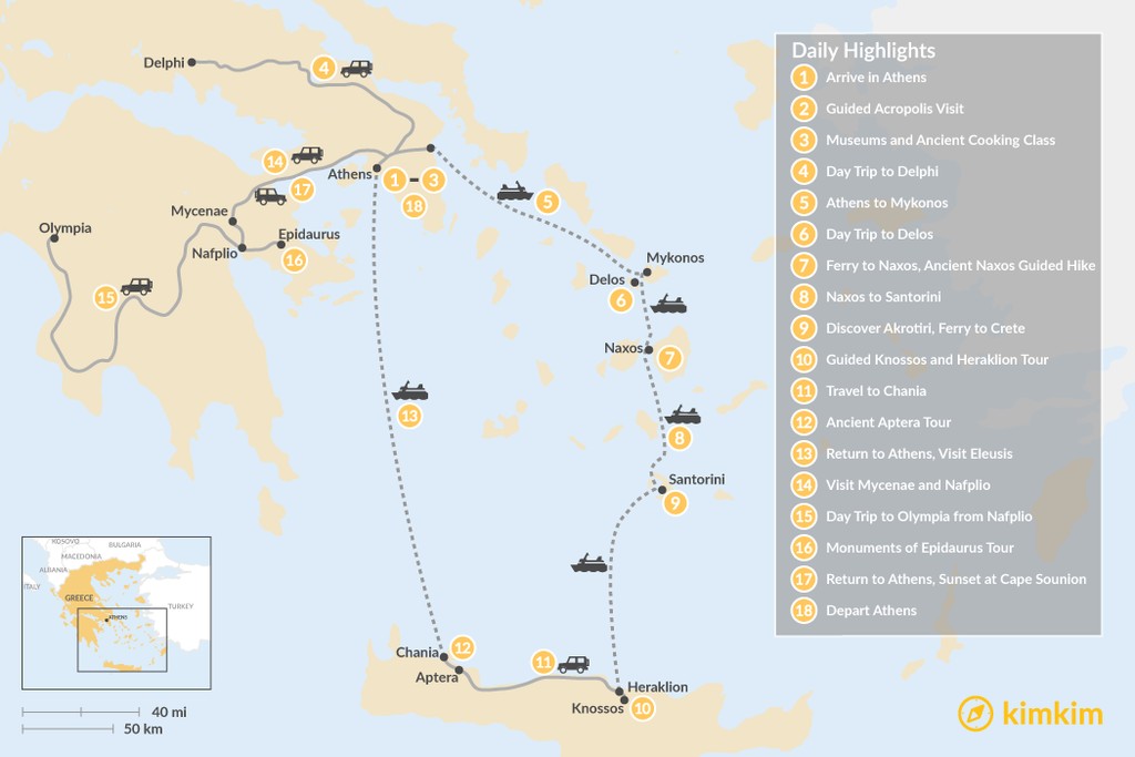 Map of Historic Athens, Mainland Greece, Cyclades, and Crete – 18 Days