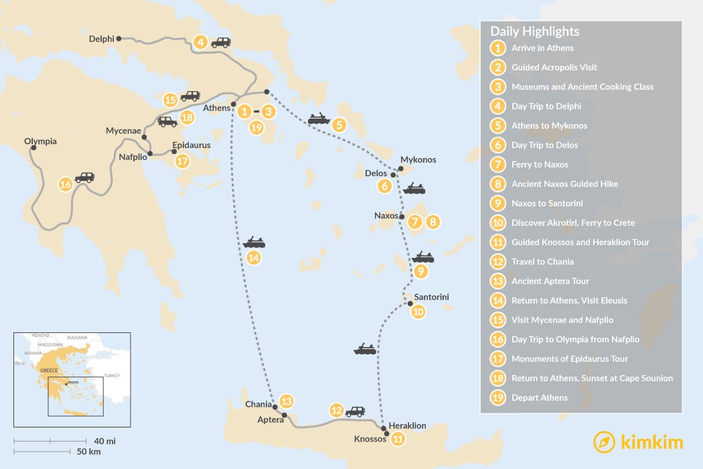 Map of Historic Athens, Mainland Greece, Cyclades, and Crete – 19 Days