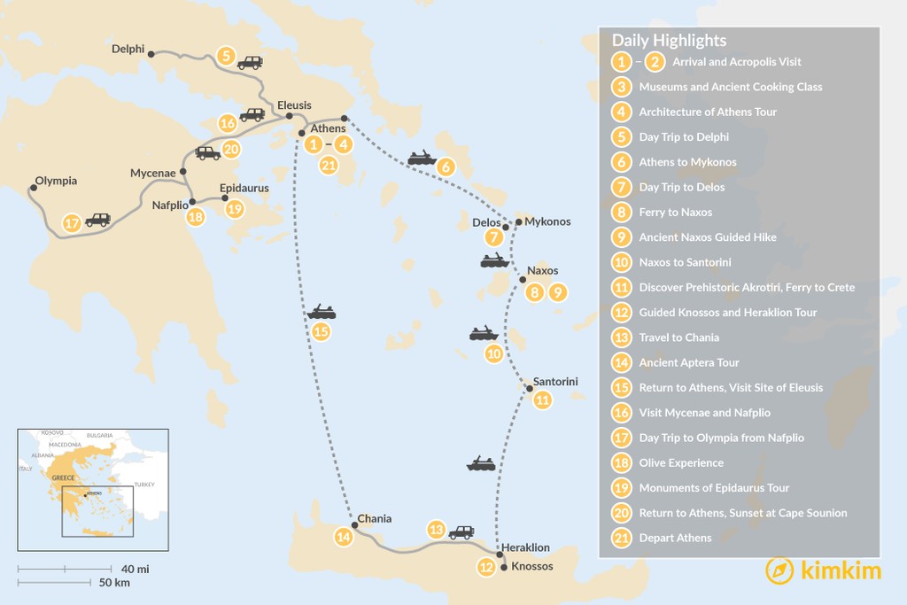 Map of Historic Athens, Mainland Greece, Cyclades & Crete – 21 Days