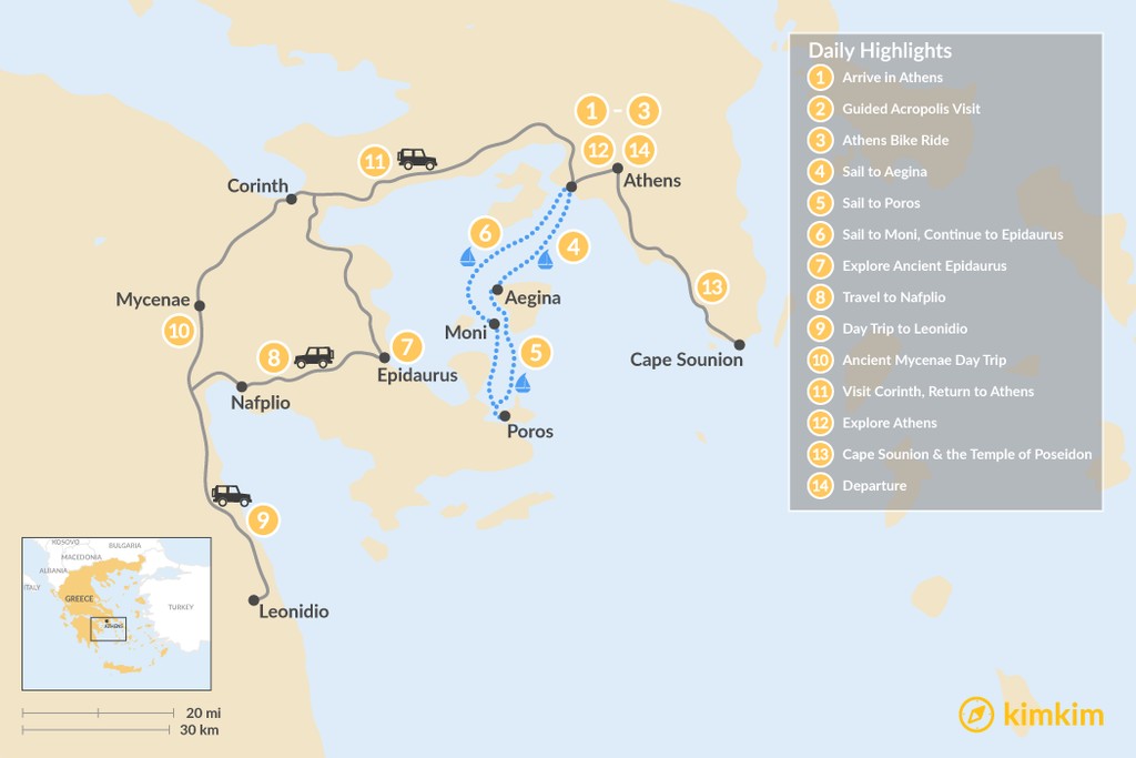 See Greece’s expansive history both archaeological and nautical with this two-week itinerary. You’ll start off atop the Acropolis before you head down for a bike ride through the Athenian city streets. Then set sail across the Saronic Gulf for your own personal island experience, stopping on Aegina, Poros, and Moni. Get back on land to proceed through ancient Epidaurus, Mycenae, and Corinth before you return to Athens.