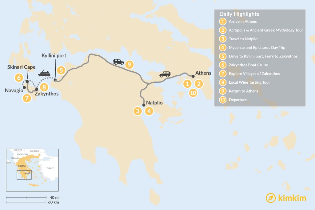 Map of Historic Peloponnese and Zakynthos – 10 Days