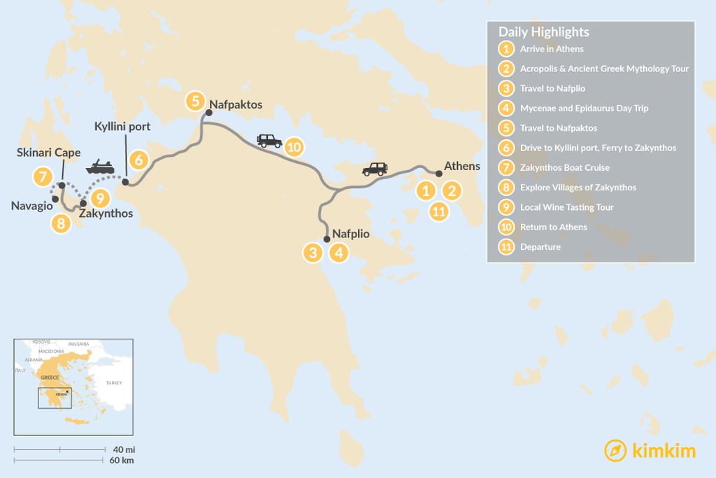 Map of Historic Peloponnese and Zakynthos – 11 Days