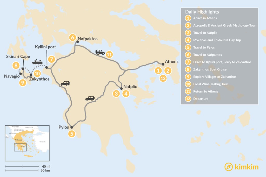Map of Historic Peloponnese and Zakynthos – 12 Days