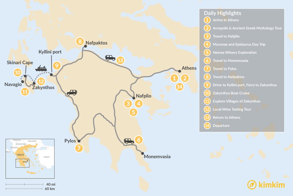 Map of Historic Peloponnese and Zakynthos – 14 Days