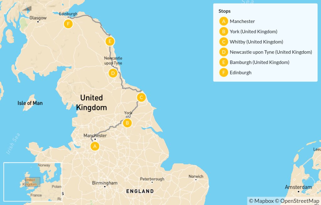 Map of Historical Highlights of Yorkshire & Northumberland – 6 Days