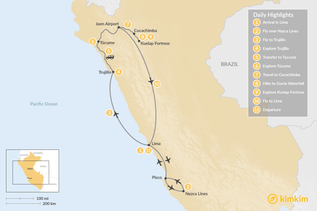 From the coast to the mountains, explore Peru’s pre-Inca cultures and ruins in this 11-day itinerary. Start in metropolitan Lima, then visit Pisco on a day trip to take a spectacular flight over the iconic Nazca lines. From here, head north up the coast to Trujillo to discover the Mochica pyramids, the mud-brick city of Chan Chan, and the Tucume pyramids of the Sican people. Drive inland through the cloud forest into the Amazonas region to see Gotca waterfall and Kuelap fortress, a walled Chachapoya structure known as the “Machu Picchu of the North”. With over 5,000 years of architecture and civilization to experience, this trip is a must on any traveler’s list.